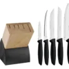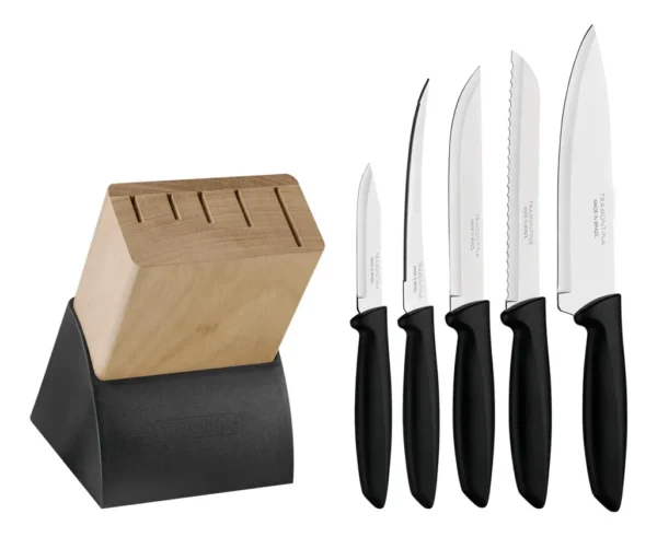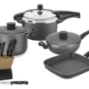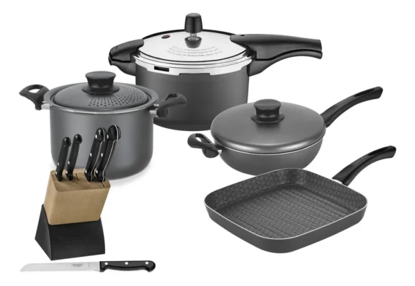 Incluye: olla pasta, olla a presión, bifera, sartén honda y cuchillos con soporte.