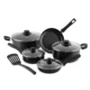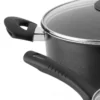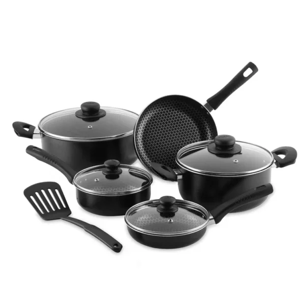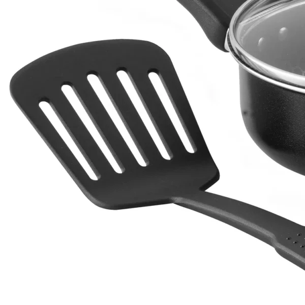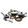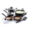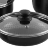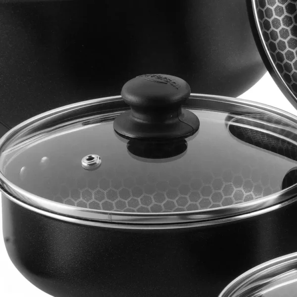 Batería de ollas con mangos y asas en baquelita, resistentes al calor para un manejo seguro.