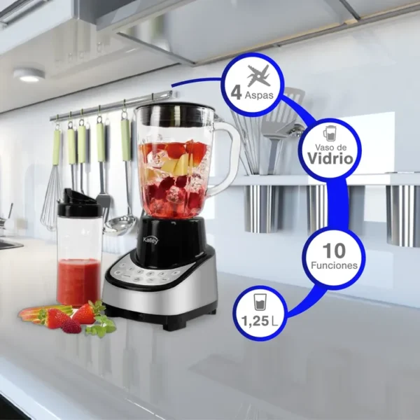 Vaso en vidrio con capacidad de 1.25Litros para que puedas preparar lo que más te gusta, más vaso personal en tritán (plásticos libres de BPA resistente y ligero) de 650ml que puedes acoplar a tu licuadora para preparar tus batidos favoritos y 6 velocidades + función smoothie + función ice crush + función MIX + función de pulso para licuar con mayor precisión según tus necesidades.