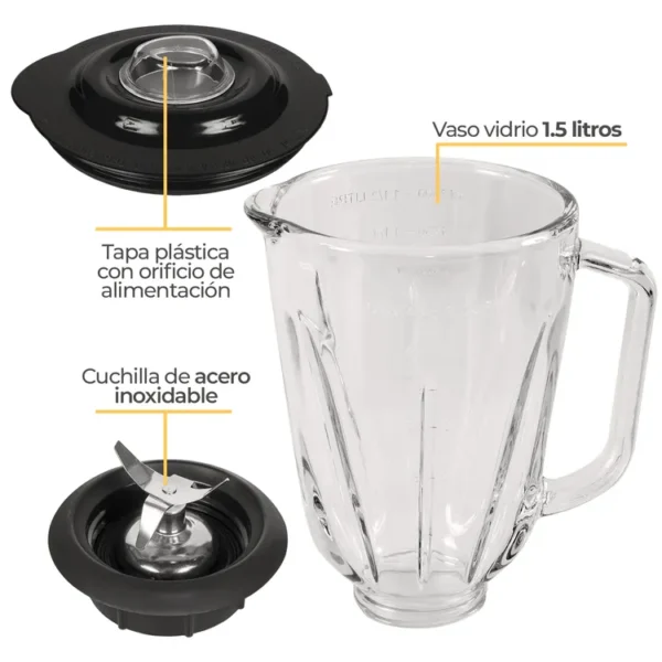 Vaso con capacidad de 1.5Litros para que puedas preparar lo que mas te gusta y 2 velocidad más función pulso para licuar con mayor precisión.