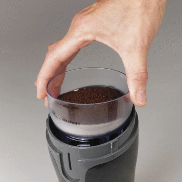 Las duraderas cuchillas de acero inoxidable también pueden moler especias, y la cámara de molienda extraíble facilita el llenado y la limpieza. El cable envuelve la base en un compartimento oculto para un almacenamiento ordenado.