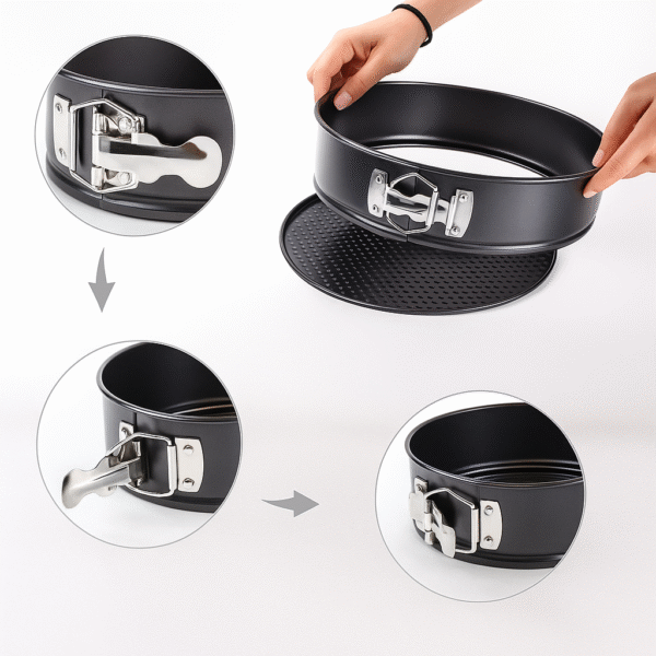 Cada molde cuenta con base antiadherente que evita que las preparaciones se peguen, garantizando un horneado uniforme y una limpieza sencilla. Su sistema de cierre lateral metálico permite desmontar fácilmente el aro sin dañar el postre, ideal para desmoldar con precisión y conservar la forma perfecta.